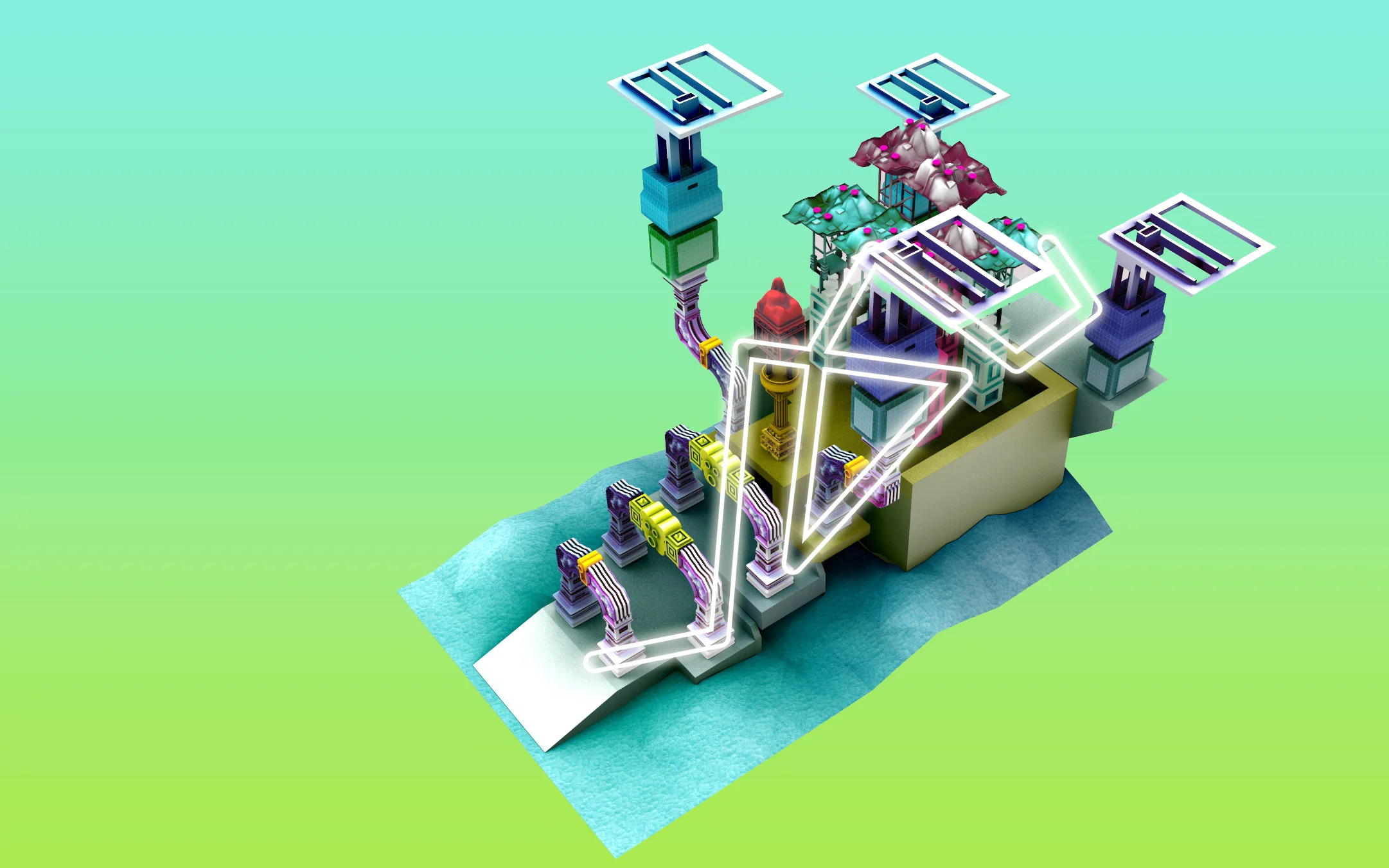 Conceptual game exploring the application of inflection into larger architectural scenarios, where multiple elements are connected through logics that the player must uncover.